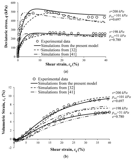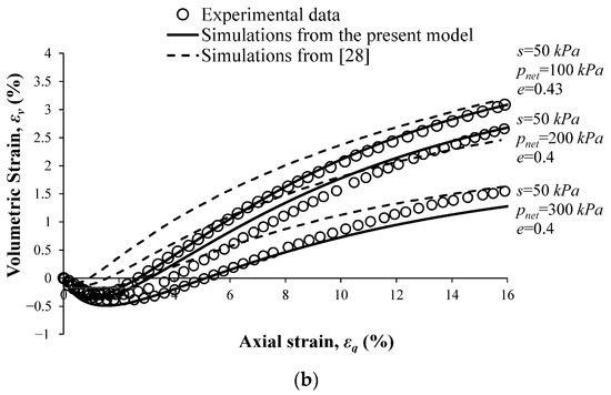 The triaxial compression tests were performed at four different suction values (50, 250, 500, and 750 kPa) and three different values of radial net stress (100, 200, and 300 kPa). In Figure 15, Figure 16, Figure 17 and Figure 18, the simulations obtained using the present model are compared with experimental data and with the simulations reported by Patil et al. [28]. Values of suction, radial net stress, and initial void ratio for each test are indicated on these figures.