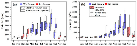(a) Mean monthly (2019–2021) rainfall (mm) over Mun and Chi River basins. (b) Mean monthly (2019–2021) river flow rate (m3/s) over Mun and Chi rivers.