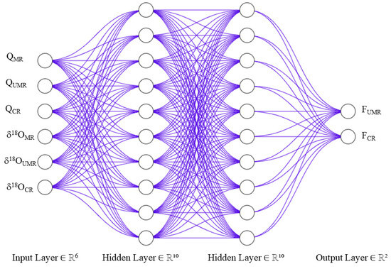 The ANN model used in this study incorporates several predictor variables, including river flow rates (Q) and isotopic compositions (δ18O). These variables are decisive for capturing the complex interactions within the river system (Figure 3). The model architecture includes input layers for these variables (6 parameters), 2 hidden layers (10 neurons each) for processing, and an output layer for predicting the contributions of the UMR and CR to the Mun River’s flow. The data preparation phase, crucial for the model’s success, involves dividing the dataset into an 80% training and 20% testing set, ensuring effective model training and validation [44]. The ANN architecture, featuring dense layers with the rectified linear unit activation and a sigmoid output layer, is meticulously designed to predict these continuous variables, FCR-ANN and FUMR-ANN, reflecting the river flow fractions [45].