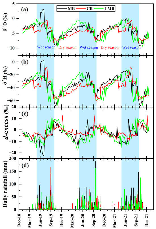 Time series of weekly stable isotopic compositions in river waters in Mun River (MR), Chi River (CR), and upstream Mun River (UMR): (a) δ18O, (b) δ2H, (c) d-excess, and (d) daily rainfall.