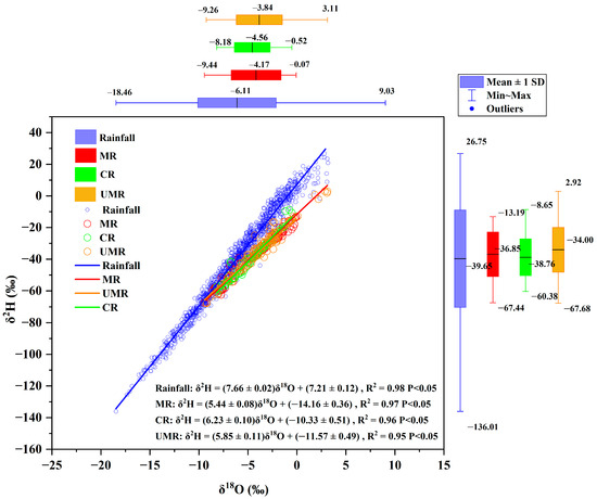 These mean values underscore the spatial variability in isotopic compositions across the Mun River Basin. The differences between locations can be attributed to a variety of factors, including local evaporation rates [49], the mixing of water sources (e.g., groundwater inputs, tributary influx) [50,51], and the regional climate’s influence on precipitation patterns [8]. The UMR and CR tend to show more depleted isotopic values, which could reflect the impact of higher elevation sources and more direct precipitation inputs, while the MR’s relative enrichment in isotopic values may indicate lower elevation sources, increased evaporation, or the mixing of different water sources as the river progresses downstream. This spatial variability provides essential clues to the hydrological connectivity and water cycle dynamics within the Mun River Basin.