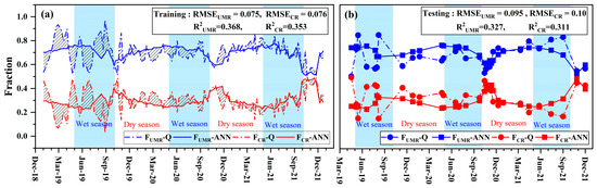The fraction of upper Mun River (FUMR) and Chi River (FCR) to the main Mun River obtained from the observed river discharge (Q) and the ANN results developed by the stable isotopes (δ18O) and flow rate of upper Mun River and Chi River: (a) Training period (80 percent of whole study period of January 2019–December 2021) and (b) testing period (20 percent of whole study period of January 2019–December 2021).