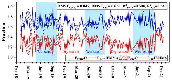 The fraction of upper Mun River (FUMR) and Chi River (FCR) in the main Mun River obtained from the observed river discharge (Q) and the IEMMA results.