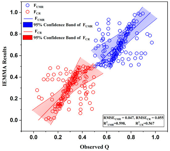 Scatterplot of the flow fraction results obtained by IEMMA and observed river discharge showing the correlation between IEMMA results and observed flow rates, with the R² and the 95% significance band indicating the model’s reliability.