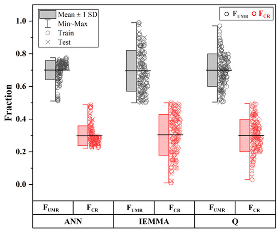 Box plot of the fraction of upper Mun River (FUMR, dark grays) and Chi River (FCR, reds) to the main Mun River obtained from the ANN results, the IEMMA results, and the observed river discharge (Q).