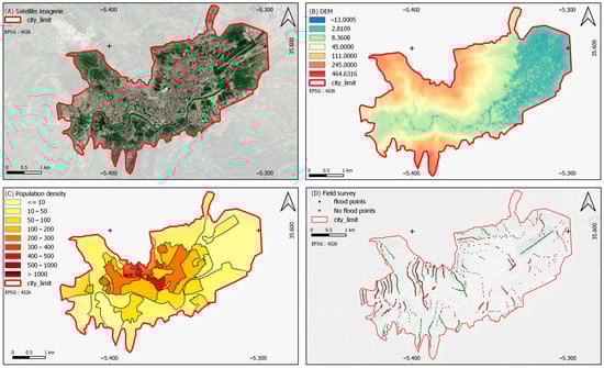 The database used: (A) an overview of the study area’s satellite imagery, (B) the elevation distribution based on the digital elevation model (DEM) of the study area, (C) the population density repartition in the study area, (D) the flooded (red points) and non-flooded (green points) locations in the study area.