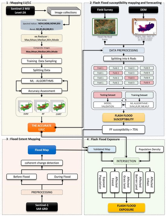 Recently, the earth’s climate has changed considerably, leading to several hazards, including flash floods (FFs). This study aims to introduce an innovative approach to mapping and identifying FF exposure in the city of Tetouan, Morocco. To address this problem, the study uses different machine learning methods applied to remote sensing imagery within the Google Earth Engine (GEE) platform. To achieve this, the first phase of this study was to map land use and land cover (LULC) using Random Forest (RF), a Support Vector Machine (SVM), and Classification and Regression Trees (CART). By comparing the results of five composite methods (mode, maximum, minimum, mean, and median) based on Sentinel images, LULC was generated for each method. In the second phase, the precise LULC was used as a related factor to others (Stream Power Index (SPI), Topographic Position Index (TPI), Slope, Profile Curvature, Plan Curvature, Aspect, Elevation, and Topographic Wetness Index (TWI)). In addition to 2024 non-flood and flood points to predict and detect FF susceptibility, 70% of the dataset was used to train the model by comparing different algorithms (RF, SVM, Logistic Regression (LR), Multilayer Perceptron (MLP), and Naive Bayes (NB)); the rest of the dataset (30%) was used for evaluation. Model performance was evaluated by five-fold cross-validation to assess the model’s ability on new data using metrics such as precision, score, kappa index, recall, and the receiver operating characteristic (ROC) curve. In the third phase, the high FF susceptibility areas were analyzed for two-way validation with inundated areas generated from Sentinel-1 SAR imagery with coherent change detection (CDD). Finally, the validated inundation map was intersected with the LULC areas and population density for FF exposure and assessment. The initial results of this study in terms of LULC mapping showed that the most appropriate method in this research region is the use of an SVM trained on a mean composite. Similarly, the results of the FF susceptibility assessment showed that the RF algorithm performed best with an accuracy of 96%. In the final analysis, the FF exposure map showed that 2465 hectares were affected and 198,913 inhabitants were at risk. In conclusion, the proposed approach not only allows us to assess the impact of FF in this study area but also provides a versatile approach that can be applied in different regions around the world and can help decision-makers plan FF mitigation strategies.