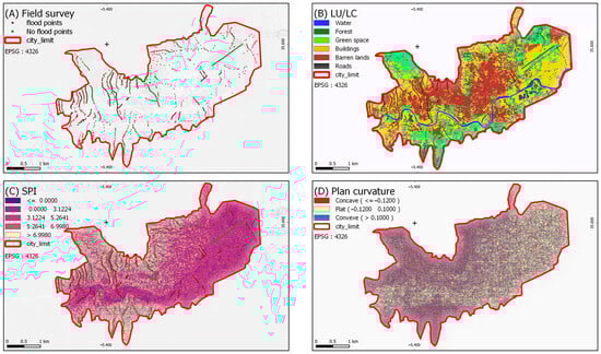 Flash flood conditioning factors in the study area: (A) Geographical distribution of flooded and non-flooded locations from the field survey, (B) LU/LC, (C) SPI, (D) Plan curvature.