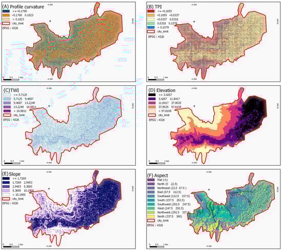 Flash flood conditioning factors in the study area: (A) Profile curvature, (B) TPI, (C) TWI, (D) Elevation, (E) Slope, and (F) Aspect.