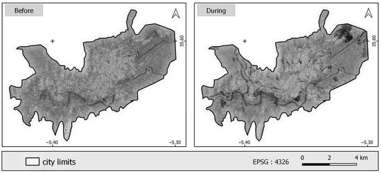 Synthetic Aperture Radar (SAR) images showing the study area before (left) and during (right) the flash flood.
