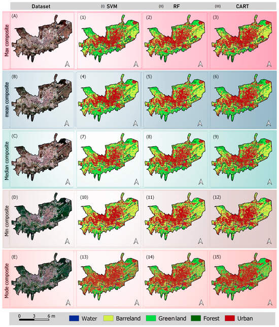 The fifteen maps produced were compared (Figure 7). This comparison in terms of OA and Kappa index gave us reasonable results, according to the USGS and Gashaw et al. [], who recommended accuracies of 85% and 80%, respectively. The best classification threshold in our case was that of SVM; it performed best for all composites (except the Min composite). The results were confirmed by many researchers who chose to use SVM to map LULC [,,]. Our approach was not only about identifying the best classifiers but also about testing performance based on multiple composites. All composites created in our study are based on a collection of images from three seasons (summer, autumn, and spring). We excluded the winter season due to the large number of clouds. A comparison between the composites used also leads to the conclusion that the mean composite performed best out of all classifiers. This was confirmed by visual interpretation and can be explained by the fact that using a mean composite reduces temporal variations and atmospheric noise by taking the mean while also mitigating the effects of cloud cover. Nevertheless, the mean composite has a weakness in some cases as it is influenced by outliers. Therefore, in the literature, we have found that some authors use the median instead of the mean [,,]. The choice of the best composite between median and mean depends entirely on the morphology of the area studied, the data specificity, and the LULC generation objective. We have chosen to use a mean composite classified by SVM for the remainder of our study, but it should be mentioned that, despite the accuracy of the results obtained, they could be improved by introducing other topographical factors into the training part of our models, which has proved their effectiveness in several studies [,,].