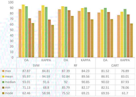 The first result obtained in this study is LULC. In that section, we aimed to evaluate several composites (Min, Max, Median, Mode, and Min) using three ML algorithms (SVM, RF, and NB) to determine those that can be used for the rest of our study. This assessment was based on Sentinel-2 imagery rather than Landsat imagery as the latter has been used by most researchers when using GEE [,]. Our decision was influenced by the study area’s morphology, which is made up of small condensed districts, and also by the diversity of land classes, which requires good spatial resolution (10 m in Sentinel 2 instead of 30 m in Landsat).