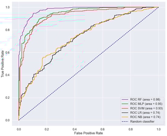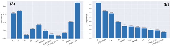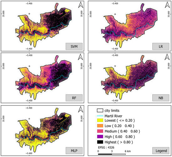 The second result generated is the FF susceptibility. For this purpose and to obtain an accurate result, we trained our models based on five ML algorithms (SVM, LR, LR, RF, NB, and MLP), with the conclusion that RF is the best classifier, which corresponds to previous studies [,,]. Therefore, we trained all our algorithms based on nine factors (topographic wetness index, LULC, profile curvature, topographic index, stream power index, plan curvature, elevation, aspect, and slope). Most studies with the same objective as ours have introduced rainfall as a factor directly influencing flooding [,,,]. Still, in our study, we neglected it because our region of interest is small and the same amount of precipitation is found all around it, so rainfall will have the same effect at any point in the region. This fact has been confirmed by numerous studies, of which the study by Shahabi et al. [] is the best example. Rainfall was introduced as a factor in the first part of the study but ultimately, it was confirmed that the relationship between rainfall and flooding is more complex than a simple correlation between the quantity of rainfall and flood intensity.