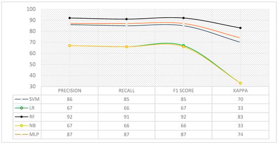 To ensure a reliable evaluation and minimize the effects of random data splitting, K-fold cross-validation was used, where K equals 4. In our case, this method divides the data iteratively into four folds (groups). In each iteration, three folds are used to form the model, with the last one being used for evaluation. To ensure that all data points are used for both training and testing, this process is repeated four times. The models were evaluated using various metrics averaged across the four folds of the K-Fold cross-validation procedure, including precision, F1 score, recall, accuracy, kappa index, and the receiver operating characteristic (ROC) curve.
