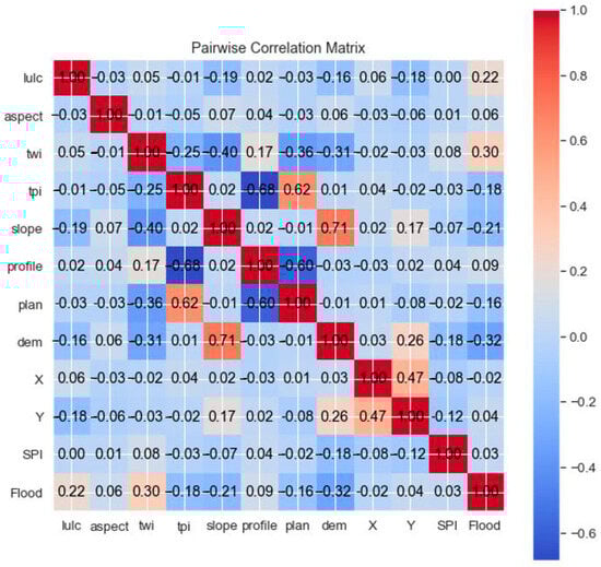 Based on the Pearson correlation analysis presented in Figure 12, it is possible to understand the strength of the relationships between the different variables. In terms of TPI and plan curvature, TPI measures the relative elevation of a point while PC assesses the relative curvature of the terrain in the direction of the slope. Since higher elevations tend to have less curvature, it is logical that TPI and PC have a strong negative correlation. Concerning slope and DEM, areas with higher DEM values tend to have steeper slopes, which explains the strong positive correlation between these two variables. In the same way, TWI and FF occurrence show a strong positive correlation because areas with higher TWI values are more likely to experience flooding, while areas at lower elevations are more vulnerable to flooding, which explains the strong negative correlation between FF occurrence and DEM. Regarding TWI and slope, wetter areas are more likely to have flatter terrain, resulting in a moderate negative correlation between TWI and slope. TWI and DEM have a moderate negative correlation, as higher DEM values (higher elevations) tend to be drier, with water flowing downhill towards lower elevations. Plane curvature and profile curvature measure opposite aspects of the surface’s curvature. Therefore, it is logical that they have a moderately negative correlation. Lower TPI values and steeper slopes are linked to higher FF risk. This is because lower TPI values indicate lower elevations and steeper slopes create more runoff, possibly leading to flooding. LULC and the other variables in the dataset are not directly related to each other. For example, a change in LULC does not necessarily lead to a change in SPI, DEM, TPI, plan, or profile. This explains the weak correlations between LULC and all variables. Finally, SPI is a measure of a stream’s erosive power over time, while the other variables in the dataset are measures of various environmental characteristics at a specific location. This explains the relatively weak correlations between SPI and most variables. It should be noted that the previous studies did not all use the same variables; rather, different variables were used in each study. In essence, the decision depends on the morphology of the study area and the nature of the event; in fact, there is no precise consensus regarding the factors that must be taken into account, but in general, it is preferable to use more than six factors to minimize the production of reflective weights that are influenced by a single weight, leading to an overestimation of certain factors responsible for flooding [].