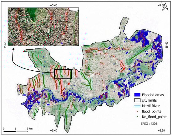 - Sellami, E.M.; Maanan, M.; Rhinane, H. Performance of Machine Learning Algorithms for Mapping and Forecasting of Flash Flood Susceptibility in Tetouan, Morocco. In International Archives of the Photogrammetry, Remote Sensing and Spatial Information Sciences—ISPRS Archives; International Society for Photogrammetry and Remote Sensing: Bethesda, MD, USA, 2022; Volume 46, pp. 305–313. [Google Scholar] [CrossRef]