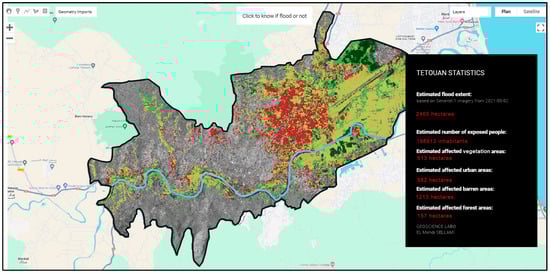 The degree of susceptibility of people, buildings, or systems to potential risks or hazards is referred to as exposure. Visualization of SAR data can be used to identify potentially FF-prone areas, although its effectiveness in urban environments is limited. The identification of areas with high FF susceptibility (>75%) allows the localization of areas at high risk of flash floods, which requires special attention in terms of emergency preparedness, infrastructure planning, and land use management to limit potential damages. In addition, the overlay of field survey points enables exposure assessments to be validated and improved by incorporating field data, thus increasing the accuracy and reliability of this approach. By overlaying these three results with LULC and population data, we identified the land use types that are most likely to be exposed and extracted the exposed population. It is important to note that areas with false positive results indicating the presence of FFs were filtered out and excluded. By accurately extracting data on the actual risk of FF, this process ensures that emergency preparedness plans and risk reduction initiatives are targeted accordingly. Using the GEE platform, FF exposure was determined and displayed on a user interface (Figure 16), which provides a global view of the exposure situation with estimated values for each affected section and the possibility to click on any part of the map to obtain information on whether the clicked point is flooded or not.