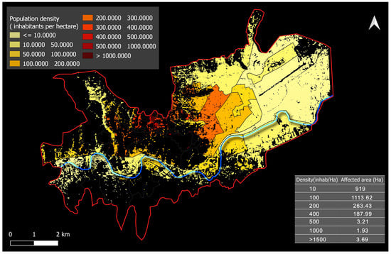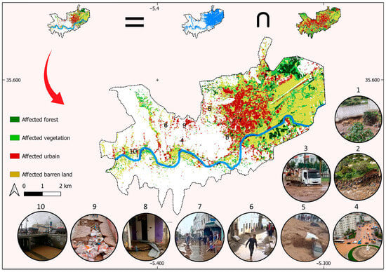 The LULC areas (barren, water, vegetation, forest, and urban) were intersected with the validated FF map to generate each affected group, which was then used to determine the areas affected by the event and assess the damage. Additionally, the population density map was also intersected with the FF map to determine the exposed population density.