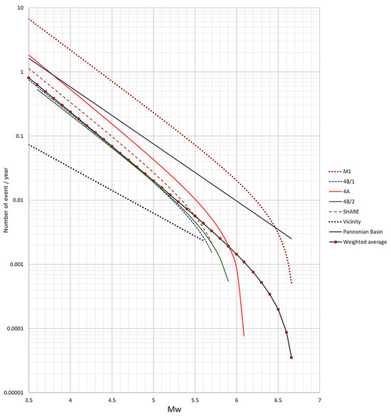 The M1 model was formed by Hungarian experts, and the SHARE model is based on international research efforts [31]. The third model is the modified SHARE model, where SHARE zone-04 is split by the Hungarian experts into zones 04A and 04B to better account for the mid-Hungarian fault system. This is based on the newest interpretation of the neotectonics of the Pannonian Basin [21,29], and on the experience of seismotectonic modelling [30].