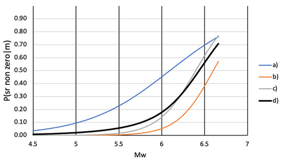 Conditional probability of non-zero surface displacement calculated by the empirical relationships of authors: curve a) by [33], curve b) by [38] and c) by [39], and curve d) is the weighted average.