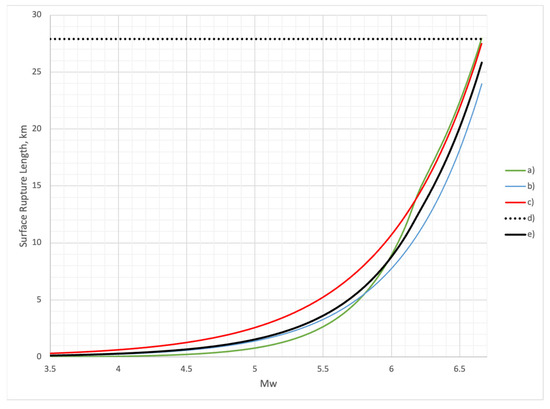 Assuming the maximum rupture length is equal to the mapped length of the fault, the maximum magnitude can be calculated, for example, by the empirical formulas published in [32,33,34,35]. All these formulas have the same form: