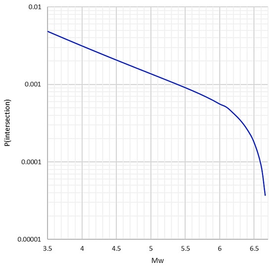 In the proposed methodology, the probability of the surface scrap of the rupture intersecting the site is calculated, assuming the rupture can occur at any position within the mapped fault length with uniform probability. This is different from [26], where the calculation of the probability of surface scarp crossing the site for three typical configurations of the fault rupture scarp relative to the site are accounted for, depending on the three rupture lengths (short, medium, and long). The uniform distribution is a conservative assumption since the rupture is preferably in the fault’s middle part; see [37]. It is important to note that, as shown in Figure 1, the NW end of the study fault intersects the site.