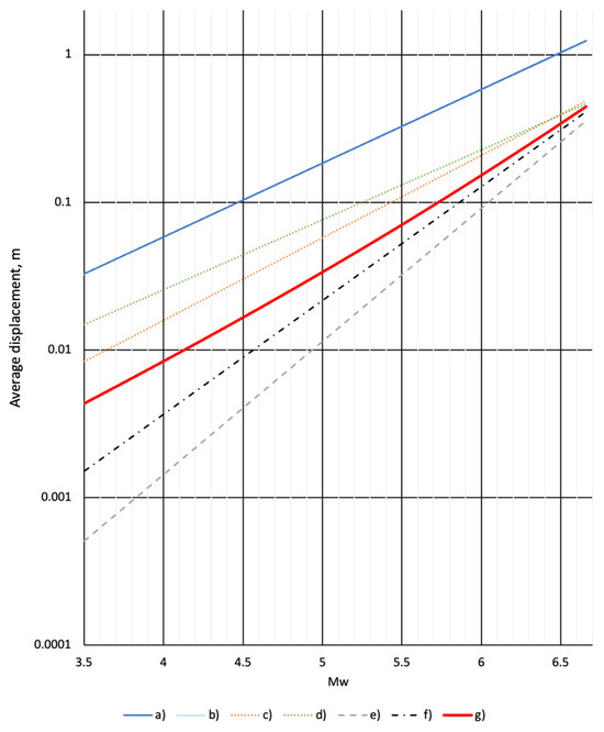 In [34], a momentum-based scaling relation is given for average subsurface displacement using the rupture length (Table 3, for in [31]) as the independent variable. The rupture length could be calculated by the scaling formula of [34] (Table 4 in [34]). This formula of [34], like the scaling formula versus magnitude, resulted in an overestimation of the average displacement compared with those obtained by the scaling relations of other authors (The two lines in Figure 10 are overlapping). This overestimation, compared to the results obtained with other correlations, seems unjustified.