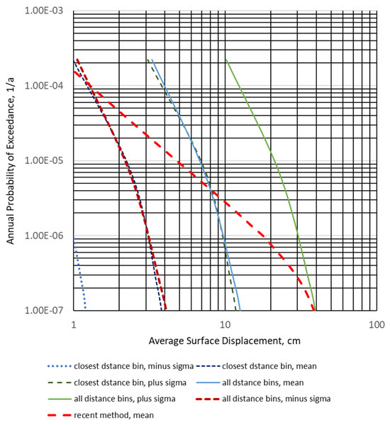 Figure 12 plots average displacement results and their dispersion for the two options of considering distance bins; see [3]. For the comparison, the hazard curve obtained by the calculation method above is also shown in Figure 12.
