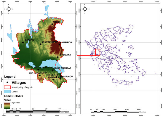 The broader area affected by the MORLEs is included in the municipality of Agrinio in Aitoloakarnania prefecture, Western Greece. Eight villages spread over the entire area of the municipality (1.247 km2) were affected by the landslides. The location of these villages, as well as the extent of the municipality, are presented in Figure 1.