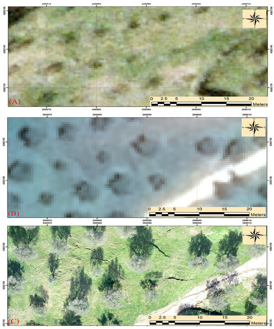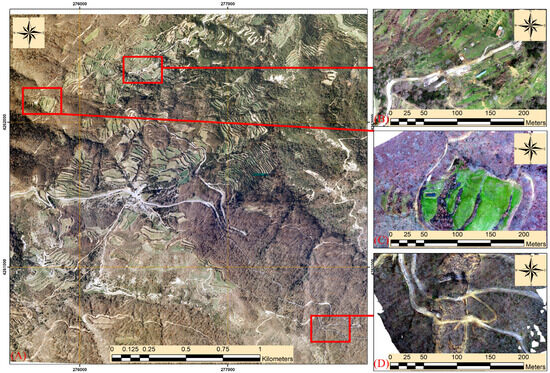 Figure 5 and Figure 6 demonstrate the effectiveness of UAV imagery in the assessment of the damage in the case of multi-occurrence landslides. In Figure 5, the basemap of the Greek Cadastral is displayed in comparison to the Pleiades imagery and to the UAV orthophoto. The basemap (Figure 5A), with a spatial resolution of 50 cm, depicts the area of Kerassovo before the landslide. The black line indicates the main road, while the yellow lines define the extent of the landslide event on 11 December 2021. In the Pleiades imagery (Figure 5B), acquired five months after the event, the landslide body is easily detected. The black line indicates the destroyed main road of the village. The specific image also has a spatial resolution of 50 cm, which permits the accurate mapping of the landslide extent. However, only the ultra-high spatial resolution οf the UAV imagery (Figure 5C) allows for the mapping of all the small cracks inside the landslide body. As can be observed in Figure 5C, there are hundreds of breaks on the ground from where the water penetrates deeper, which may cause reactivation of the landslide.