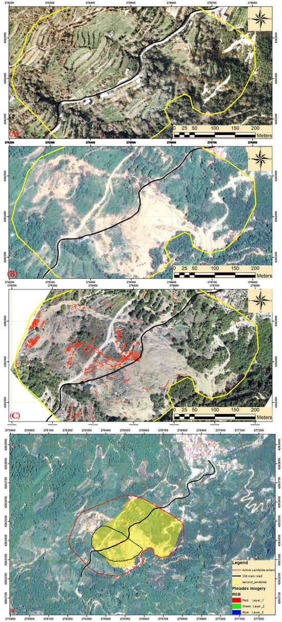 (A) The basemap of the Greek Cadastral presents Kerassovo before the landslide; (B) the same area from Pleiades imagery; (C) the landslide as mapped in the UAV orthophoto (the black line indicates the main road, while the yellow lines define the extent of the landslide event on 11 December 2021); (D) a simplified map of the landslide.