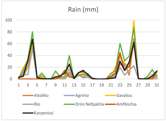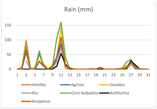 Figure 8 presents the respective precipitation values of the same meteorological station on December 2021. As can be observed on 11 December 2021, extreme rain of 160 mm was recorded in Orini Nafpaktia and an extreme of 140 mm was reported in Gavalou station. A total of 110 mm of rain was measured in Karpenissi, and more than 85 mm of daily rain was observed in Agrinio.