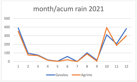 The total precipitation per month for 2021 as measured in the meteorological stations of Agrinio and Gavalou.