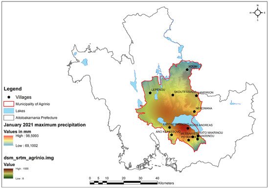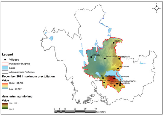 Lake Trichonida is located in the middle of the Agrinio municipality. The villages of Ano and Kato Kerassovo, Makrinou, Messarista, Neromana, and Agios Andreas are located at the south of Lake Trichonida. According to the spatial distribution of the precipitation (Figure 10 and Figure 11), a local maximum of precipitation is observed over those villages, while Lake Trichonida seems to represent a physical barrier, accelerating the rainfall extremes at the southern part. Specifically, the rainfall in this local region varied between 80 and 100 mm on 25 January 2021 (Figure 10) and between 100 and 140 mm on 11 December 2021 (Figure 11).