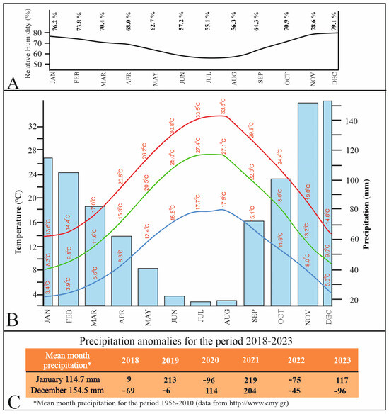 (A) The relative monthly humidity for the period 1956–2010; (B) precipitation and minimum, mean, and maximum temperature for the same period; (C) precipitation peaks during the 2018–2023 period.