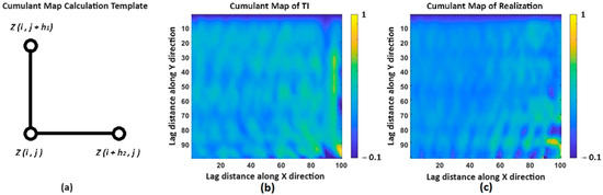 Figure 23c reveals that the second-order statistics of the continuous training image were also well reproduced, and the TI variogram falls in almost the middle of the ones for the realizations for different lag distances. To show the multiple-point reproduction of the TI using the proposed pixel-based method, three-point cumulant maps of the training image and a simulated realization are generated and presented in