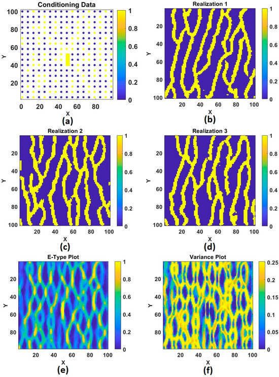The vertical streams were reconstructed with a reasonable accuracy according to the E-type plots, and the variability over those locations is less, even with such a small number of hard conditioning data points. The dense rectangular area of the conditioning data of the same class is dominated by the opposite class on its left and right side in the E-type plot and in almost all of the realizations. It is an indicator of the ability of the model to respect the formation of channels. In fact, the width of the original TI channels is honored in that area of dense conditioning data. The variability above and at the bottom of the rectangular channel-class stream is high. It is due to the shapes that are present at the channel TI, as the channels maintain a straight path for a limited length, and after that, they tend to turn to other directions with certain angular deviations.