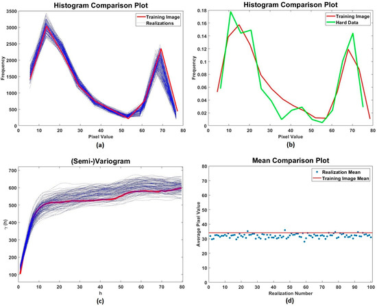 Figure 17b also confirms the similarity of the first-order statistics of the TI (red line) and realizations by comparing their average values. Looking at the realizations produced by the proposed method (