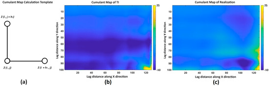 Figure 14 presents cumulant maps of the TI and a realization. From the cumulant maps, it can be inferred that for small lag distances, from the cumulant maps, the proposed algorithm is able to reproduce the third-order statistics of the continuous TI in unconditional simulation. For larger lag distances, a reasonable match is also observed in most of the areas within the maps. The variability shown in the variance plot is almost high across the whole domain, and high-value channels are propagated in different locations within different realizations according to the E-type plot, which shows the unconditional simulation is performing well in generating equiprobable reconstructions of the TI.