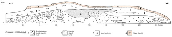 Cross section of the Knocknagoneen drumlin, modified from [4], depicting the four different lithofacies described in that study.