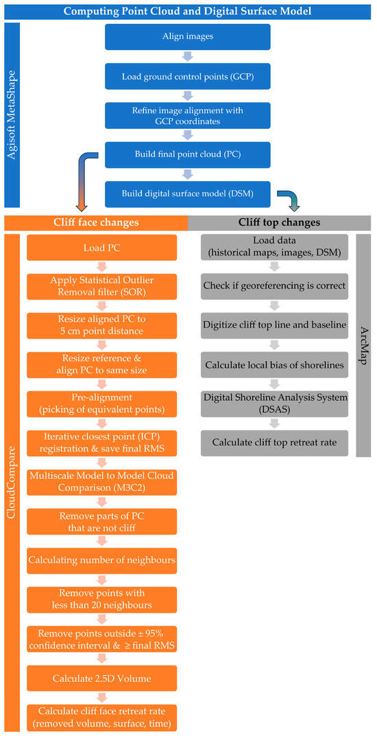 For this study, we used historical maps, orthophotos, and recent UAV surveys to investigate changes in cliff top and cliff face position at Knocknagoneen (Table 2). The cliff top changes were analysed using the Shoreline Analysis System (DSAS) Version 5.0 [60,61] in ArcMap 10.4, while cliff face changes were detected using a multiscale model-to-model cloud comparison (M3C2) in CloudCompare, v2.13 alpha [62,63]. A detailed overview of the workflows is given in Figure 6.