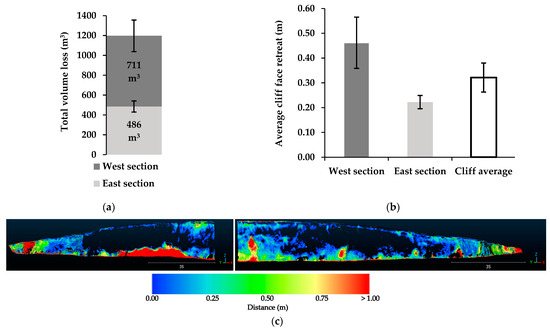 (a) Total volume of sediment lost from the cliff face between 11 June 2019 and 21 November 2023. (b) Average retreat rate of the cliff face over the same period. (c) Erosion of the cliff face along the western (left panel) and eastern (right panel) sections for the same period (note the scale difference between Figure 7c and Figure 8a). The changes were described as distance based on the results from the M3C2 calculations. Black areas within the wall show changes within uncertainty values. Those values include erosion as much as technical accretion. The accretion is assumed to be a result of analysing errors.