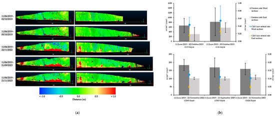 Mapped cliff face changes and calculated rates of erosion and cliff face retreat. (a) Cliff face changes in the western (left panels) section and eastern (right panels) sections calculated using PC analysis. Only values outside uncertainty values are shown in colours; values within uncertainty are shown in black. The changes were described as distance based on the results from the M3C2 calculations. Positive values indicate sediment loss, while negative values indicate sediment gain. (b) Erosion rates (er) and cliff face retreat rates (cfr) for the western and easter sections. The upper panel depicts the rates of erosion and cliff face retreat between 11 June 2019, 2 October 2019, and 5 October 2019. The lower panel shows the rates for 11 June 2019–22 November 2022, 21 September 2023, and 21 November 2023.