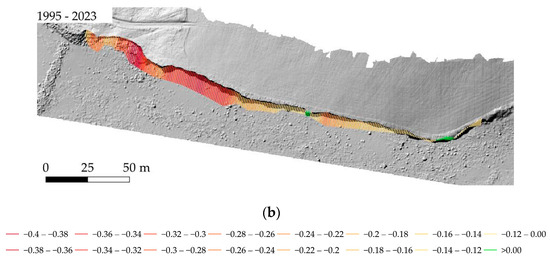 We applied the M3C2 algorithm to the five periods listed in Table 3. This algorithm compares two PCs directly, without previous meshing or gridding [62], thereby enabling us to detect specific areas that experienced material loss or gain over time. Since most higher parts of the cliff face are nearly vertical, areas indicating net gain most likely reflect higher registration errors [13]. These areas were excluded from the calculation of erosion and cliff face retreat rates accordingly. Where any apparent change in the position on the cliff face was less than the error of the registration, we assumed that no significant change was detectable within the calculated certainty [62].