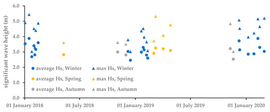 Storm events between 1 January 2018 and 29 February 2020, based on detected averaged and max significant wave height (Hs).