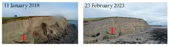 Although we attribute coastal cliff erosion to marine erosion mechanisms, we are cognisant of the potential role of subaerial mechanisms acting on the cliff. Based on repeat visits to the site, there was very limited evidence of rainfall-induced erosion processes such as rilling impacting cliff stability. It is noted that rainfall events can influence subsurface pore pressures and cliff stability that are not discernible during site visits [82]. The potential influence of subaerial processes requires further investigation, especially in wet climates like Galway (see Section 2.1), but it is assumed that marine forces are the dominant control on cliff stability.