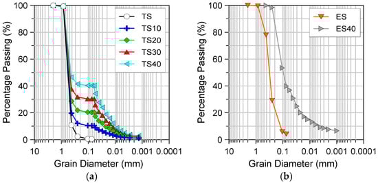 The materials tested in this study comprised clean sands and sand–silt mixtures. Ticino sand (TS) is a uniform coarse-to-medium natural sand recovered from the Ticino River in Italy, whereas Emilia Romagna sand (ES) is a poorly graded, medium-to-fine sand. Mixtures of Ticino sand with non-plastic fines were tested, namely, 90% sand/10% fines (TS10), 80% sand/20% fines (TS20), 70% sand/30% fines (TS30), and 60% sand/40% fines (TS40). Since the fthre value for the Ticino–silt mixture was found to be 24.5% [22], the present study takes into account both cases of fc < fthre and fc > fthre. Emilia Romagna’s silty sand (ES40) consists of 40% low-plasticity fines (with a plasticity index less than 8). Both ES and ES40 were recovered from a site where liquefaction phenomena occurred in Italy after the 2012 earthquake.