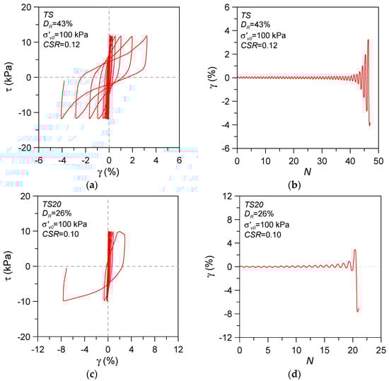 Figure 4 illustrates for two silty sand specimens (TS and TS20) the undrained cyclic simple-shear response in terms of shear stress (τ)–shear strain (γ) curves (Figure 4a,c) and the development of shear strain (Figure 4b,d). Figure 4 shows the two typical behaviours observed in all the CSS tests (Table 2), namely, cyclic mobility (Figure 4a,b) and flow failure response (Figure 4c,d).
