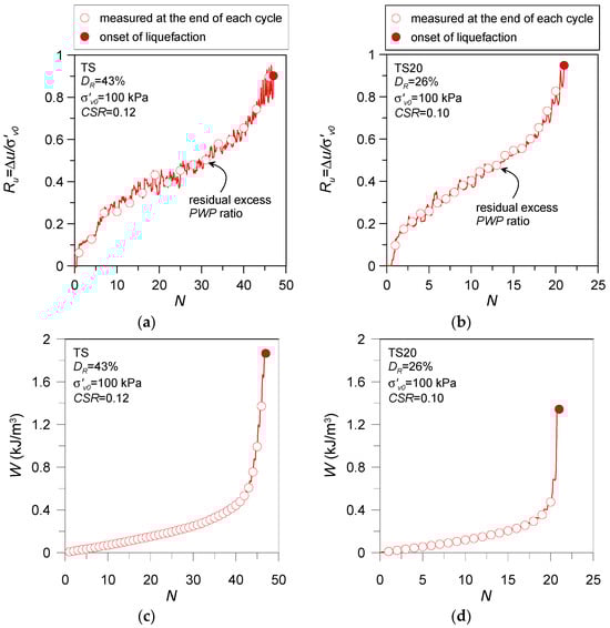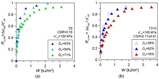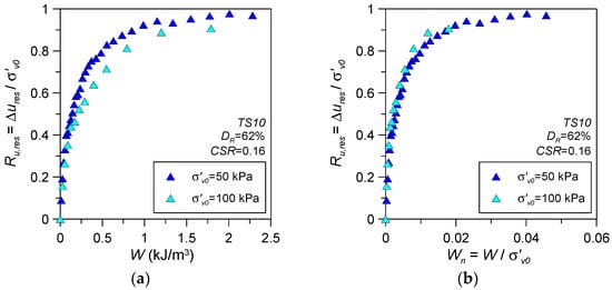 As expected, for TS10 consolidated under σ′v0 = 100 kPa, the development of Ru,res (Figure 9a) is faster than the corresponding specimen consolidated under low values of σ′v0 (50 kPa) so that a lower number of cycles is needed for liquefaction. Similarly, for the specimen tested at σ′v0 = 100 kPa, the W versus N curve (Figure 9b) grows more rapidly with lower values of cumulative dissipated energy at liquefaction compared to the corresponding specimen consolidated under σ′v0 = 50 kPa. This experimental evidence can be explained by the fact that higher material compressibility is expected for higher confining stresses, as demonstrated by different studies in the literature [50,60].