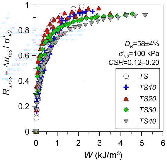 Figure 6 presents the residual excess pore water pressure ratio (Ru) versus cumulative dissipated energy (W) for clean Ticino sand and the Ticino sand mixture (fc = 20%) tested in the same initial state but subjected to different cyclic stress amplitudes (CSRs).